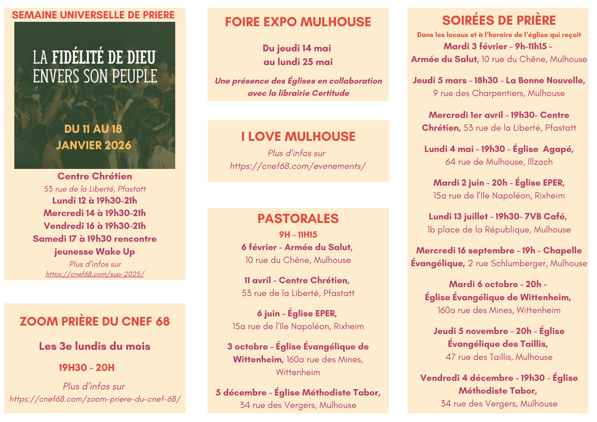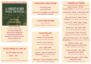 All ÉvènementsCalendrier Cnef Mulhouse 20261 janvier 2026 de 8 h 00 à 31 décembre 2026 de 17 h 00Évènement Navigation« Pastorale du Cnef MulhouseTéléchargez le calendrier 2026 du Cnef Mulhouse ci-dessous :Calendrier-2026 Cnef Mulhouse Détails Début : 1 janvier 2026 de 8 h 00 Fin : 31 décembre 2026 de 17 h 00 Ajouter au calendrier Google Agenda iCalendar Outlook 365 Outlook Live